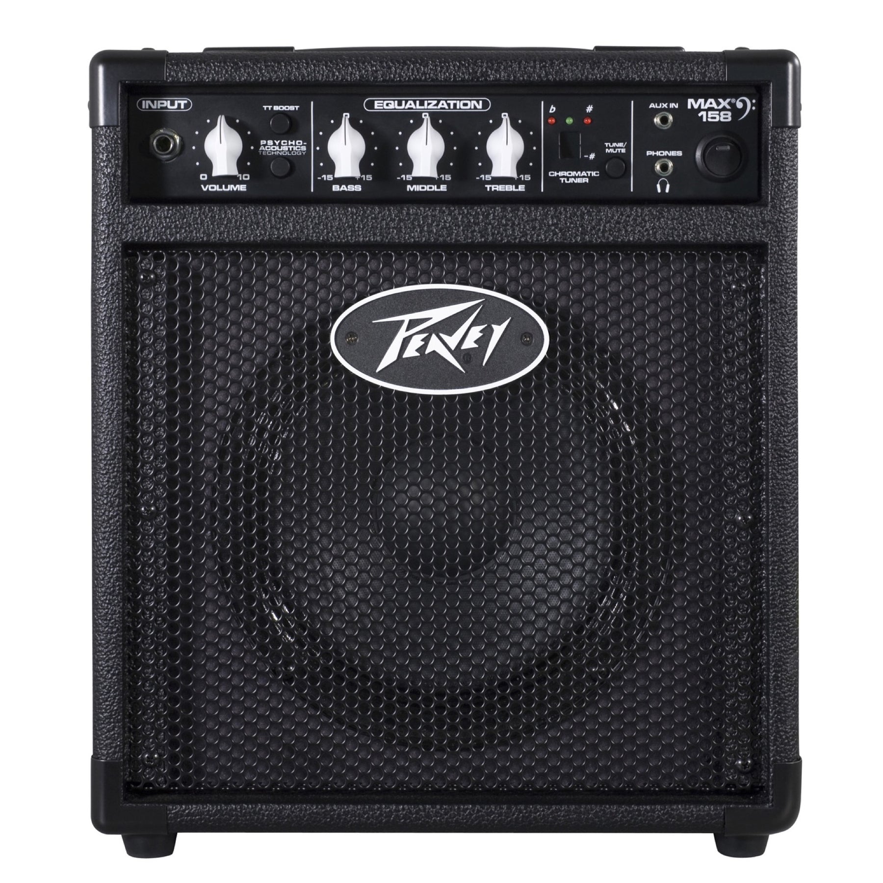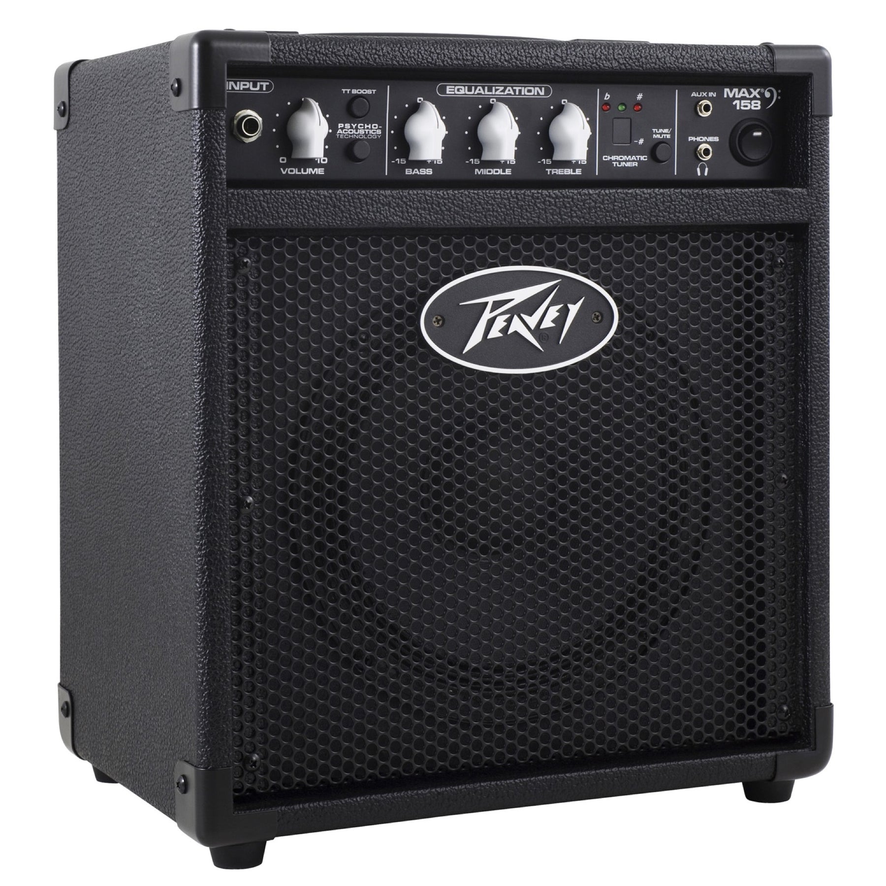 The Peavey Max 158 bass amp is a 15-watt 1x8" combo practice amp loaded with features. Features include 1/4" input, volume with Transtube distortion boost and psycho-acoustic low-end enhancement. The Max 158 also features a three-band EQ, chromatic tuner and 1/8" jacks for phones output and aux input. The Max 158 also includes patented Peavey DDT speaker protection.