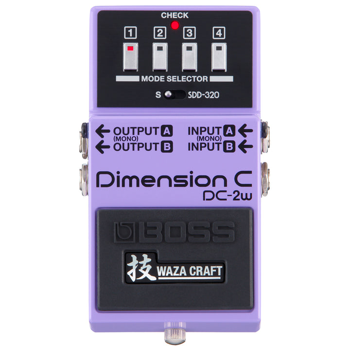 Introduced in 1985, the DC-2 Dimension C pedal brought the Dimension D's distinctive spatial effect to the Boss compact pedal format. While the Dimension D was designed as a studio effect that supported either mono or stereo input sources, the DC-2 was specifically created for mono sources like guitar, and features a modified circuit that produces a Dimension effect with a slightly different tonal flavor.When S (Standard) mode is selected, the DC-2W delivers the exact sound of the original DC-2 pedal. Despite players trying, pressing multiple buttons on the DC-2 didn't actually produce any sound variations. Similar to SDD-320 mode, pressing two buttons at once in the DC-2W's S mode provides access to six different "in-between" sounds not available on the original DC-2.Waza Craft: The Art of Superior Tone