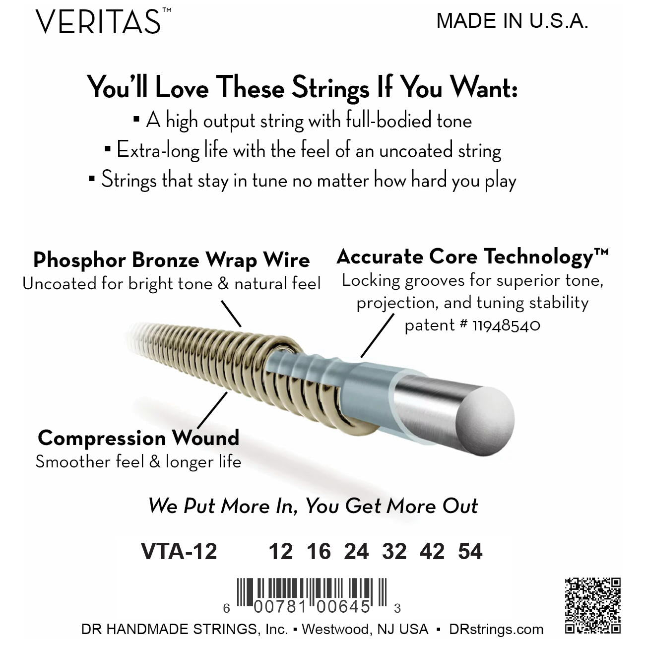 DR Strings VTA-12 Veritas Medium Acoustic Guitar Strings maintain their tone, tuning stability and intonation thanks to our Coated Core Technology, a process of coating the round core wire, which locks the wrap wire in place and extends string life by protecting the core from corrosion.