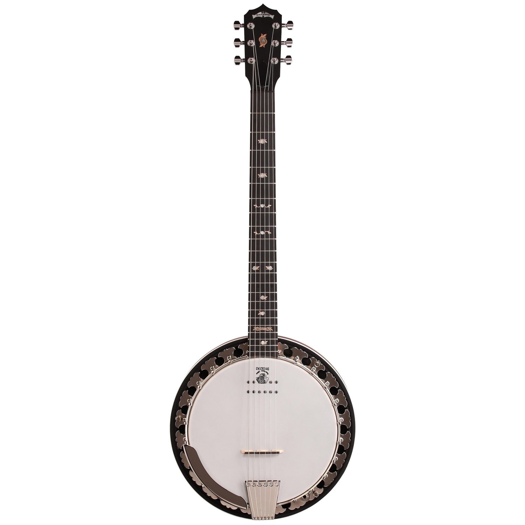 The Deering Boston 6-string banjo has big resonant bass notes that you don't find on a 5-string banjo, and also crisp highs for that beautiful banjo tone. The Kavanjo Banjo Pickup provides professional sound when playing live or in the studio. Other features include a Mahogany resonator with white binding, tropical American Mahogany neck, arched Ebony fingerboard, 3/16 inch nickel plated steel rim and 24-piece butterfly flange.