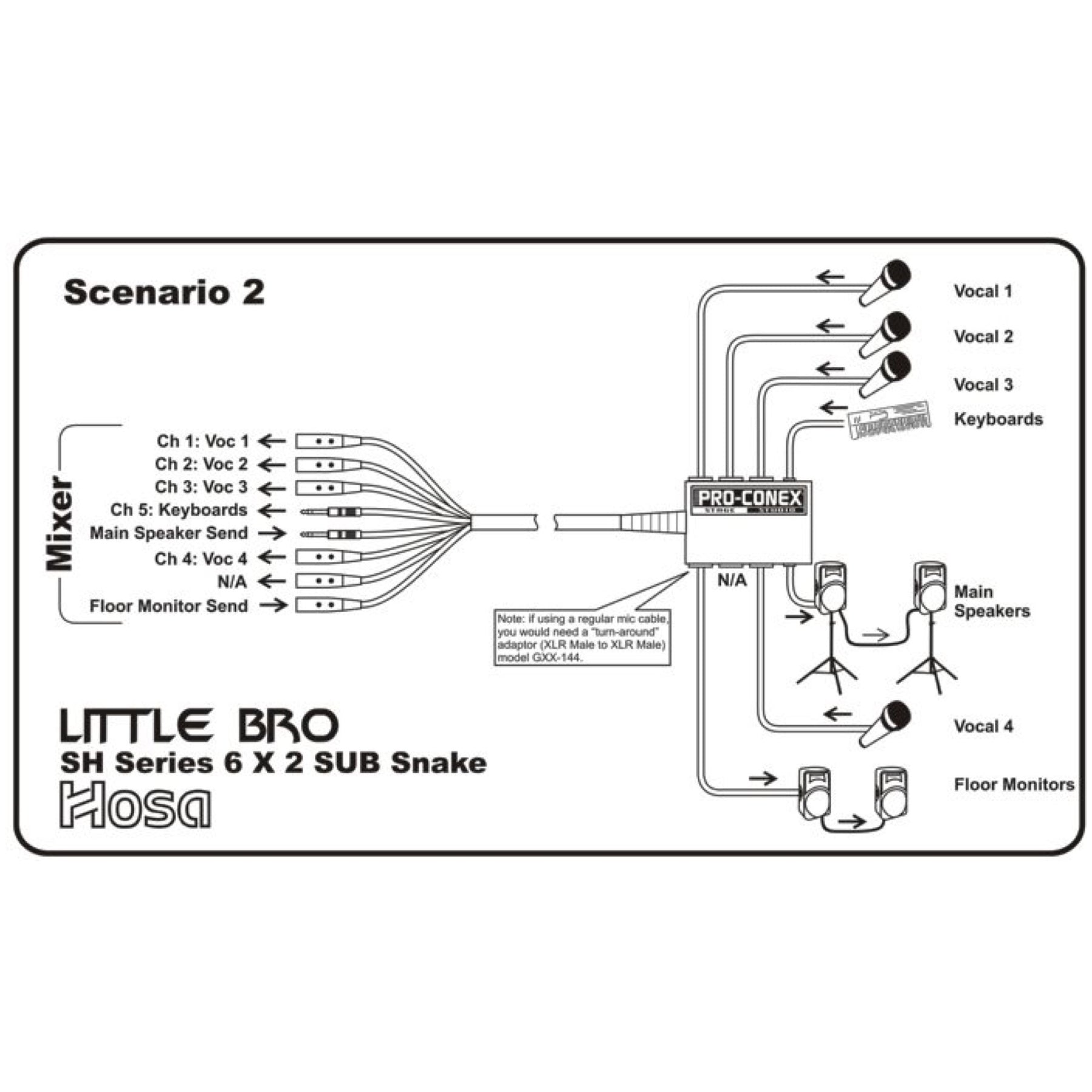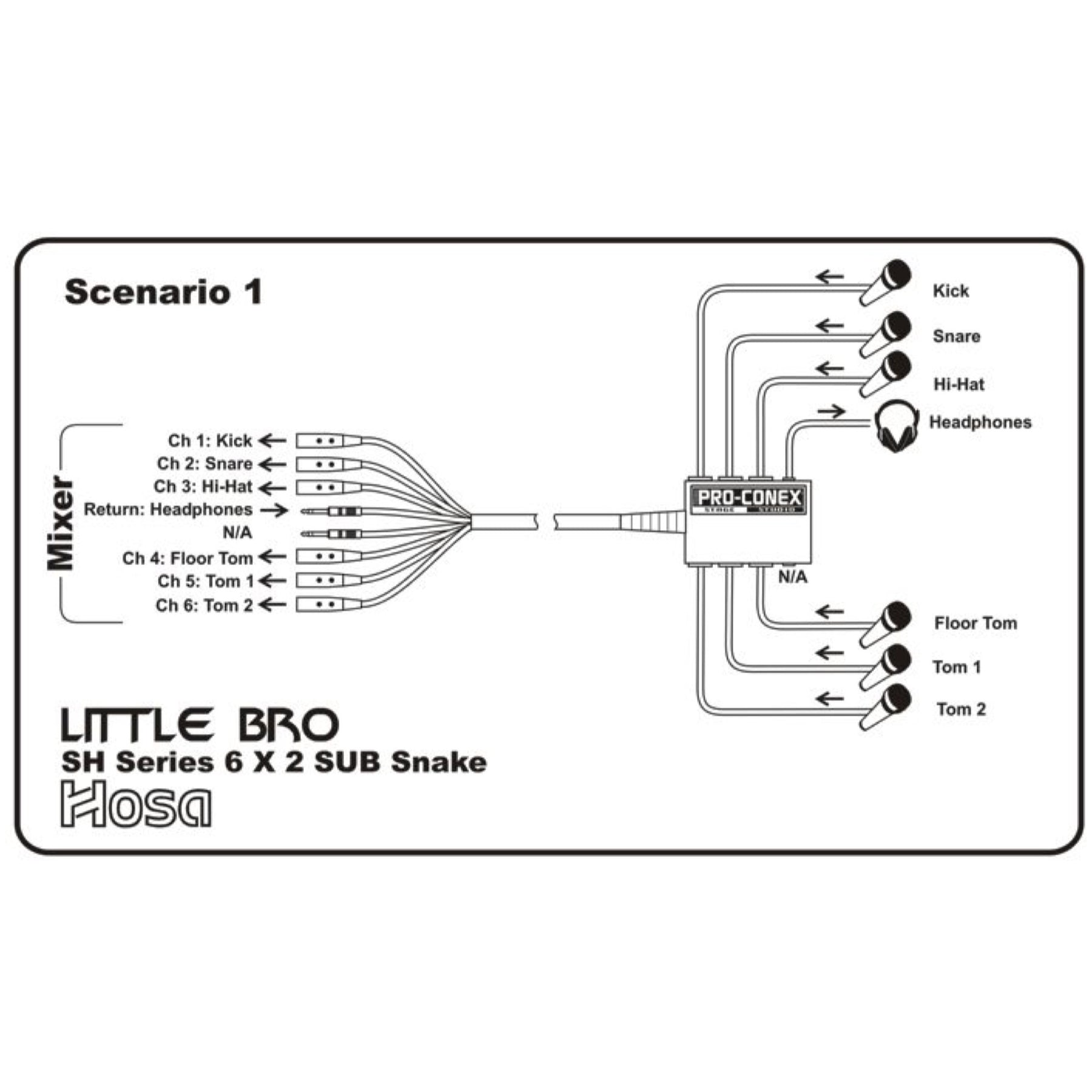 Hosa Pro-Conex Little Bro Snake's compact design has six mic sends and two multi-purpose balanced 1/4-inch sends. The Hosa Little Bro makes an excellent drum snake. The 1/4-inch sends can be used as a headphone out, or for sending line out signals from a drum module. Use it in the studio and send two separate stereo monitor feeds back to the musicians.