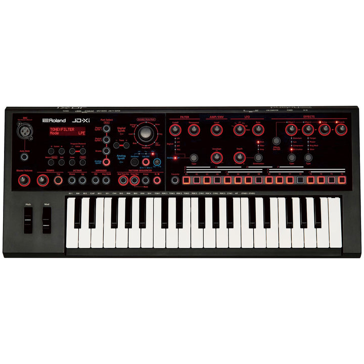 Tiny, mighty, and affordable, the JD-Xi puts a true analog synth engine, Roland's famous SuperNATURAL synth sounds, and many other creative tools under one hood. Equipped with 37 mini keys, this compact instrument delivers fat, warm analog bass and lead tones with ample controls for hands-on tweaking, plus polyphonic PCM essentials like pads, strings, brass, and more. Create impressive loops in a flash with the pattern sequencer and built-in drum kits, and explore expressive vocal textures with the gooseneck mic, Vocoder, and AutoPitch. Small in size and large in versatility, the JD-Xi is all about big sounds and big fun!With its unique crossover sound engine, the JD-Xi provides the best of both worlds: the warm, smooth response of classic analog, and the clarity and versatility of modern digital. The monophonic analog synth section features saw, triangle, and square waveforms with pulse-width modulation and an analog filter, plus an independent sub oscillator for low-end power. Two digital synth sections offer 128-voice polyphony and a wide range of high-quality SuperNATURAL synth tones, including pads, strings, electric piano, sound effects, and many others. The JD-Xi comes with a sturdy, high-quality gooseneck mic that brings even more fun to the party. Using the Vocoder, you can sing into the mic and control the tone and pitch via sounds played on the keyboard. With AutoPitch, it's simple to achieve the exaggerated, robotic vocal sounds that are common in today's pop and electronic music styles. There's also a cool Auto Note function that allows you to "sing" JD-Xi synth sounds without touching the keyboard! Using the intuitive pattern sequencer and large selection of onboard sounds, you're able to create and perform sophisticated music with only the JD-Xi. The sequencer offers four separate tracks--two digital synth parts, analog synth, and drums--allowing you to build rich-sounding loops for any genre. Real-time and step recording modes are provided, along with a special TR-REC mode for programming in the style of Roland's classic TR-series beatboxes. It's easy to play patterns and tweak sounds as you perform, and many preset patterns are built in for jamming right out of the box.Packed with a variety of dynamic drum kits, the JD-Xi delivers quality rhythm tones to suit any groove. Included are many types of electronic and acoustic kits, and the drum instrument assignments are conveniently labeled above the keys for quick identification. You can also personalize the kits for your music by adjusting filter, envelope, pitch, and pan parameters on individual drum sounds. The JD-Xi includes four simultaneous effects sections for enhancing any sound. Effect 1 and 2 provide selectable processing options such as Bit Crusher, Slicer, and Ring Mod, while dedicated Delay and Reverb sections make it easy to envelop sounds in spacious ambience. Each effects section can be turned on/off separately for the three synth sections and drums, allowing you to shape your mix with many creative combinations.