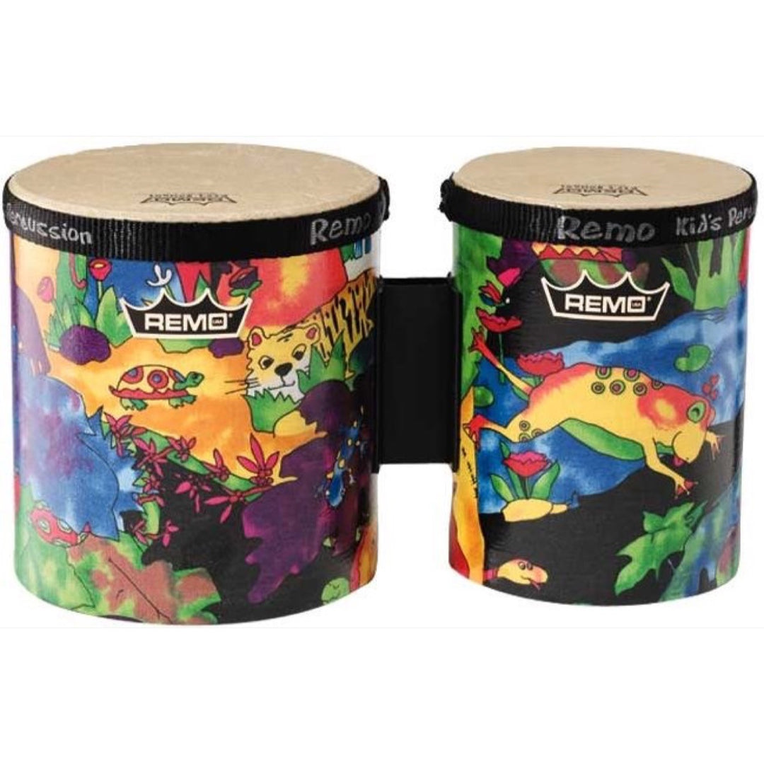 Bongos are an important part of the Afro-Cuban family of rhythm instruments. Normally held between the player's knees and played with the fingertips, the bongos have a high pitched sound that can be clearly heard over the other instruments. Like many drum and percussion instruments from around the world, the sound of the bongos is different when played at the edge of the head and the middle of the head. Bongo players combine these sounds and rhythms between the high and low bongo drums to create "patterns" that other players and listeners can easily recognize.Remo Kids PercussionChildren love to make music, and, since rhythm is the foundation of all music making, the Remo Kids Percussion Collection gives children an exciting way to make music with their own instruments. Not only is playing music fun, research has found that music participation can have a beneficial and long lasting impact on a child's self-discipline and self-confidence. Remo Kids Percussion is a positive, healthy introduction to music and rhythm