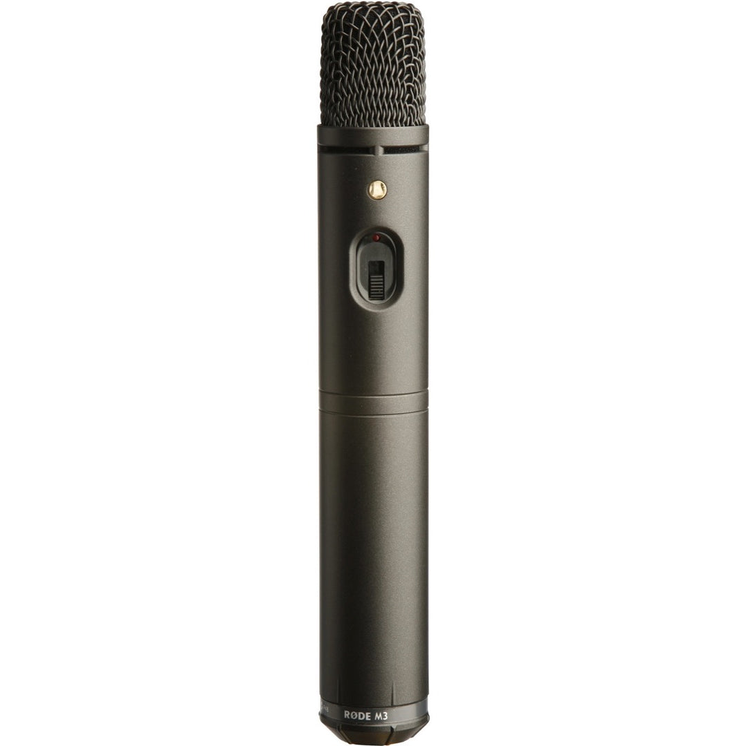 The M3 is an extremely versatile microphone that is at home in the studio, on location, or wherever a low-noise wide-response cardioid condenser microphone is demanded.An end address condenser microphone, the M3 features a heavy-duty metal body, category leading low self-noise, three stage PAD (O, -10db, -20db), a battery status LED and a High Pass Filter.The M3 also comes complete with windshield and a stand mount, and can be powered via a 9V battery or 24-48V Phantom.