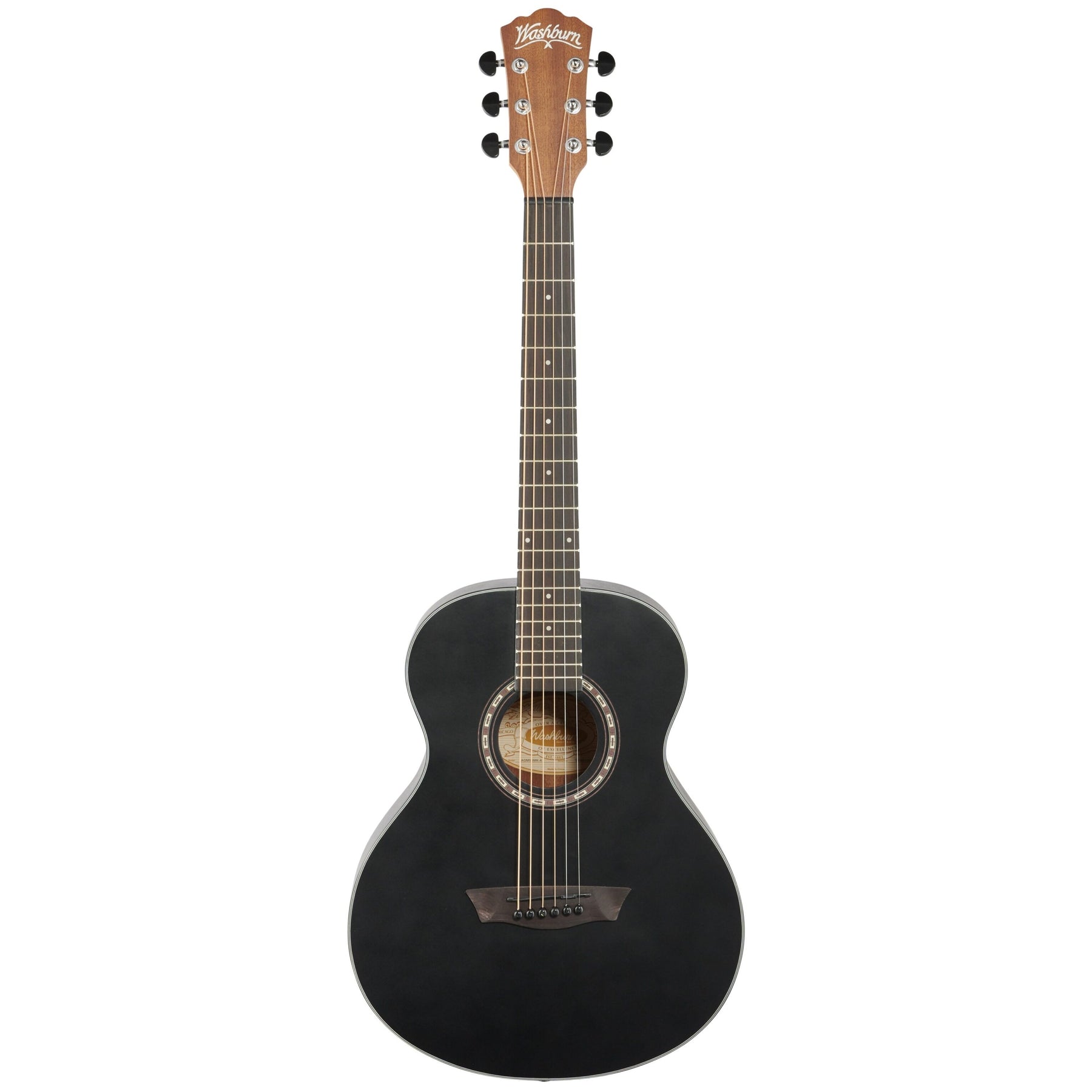 With the G-Mini 5 BK, Washburn builds on the success of their AGM5K Apprentice G-Mini with an exciting matte black model. Sharing the scaled down proportions of its sister instrument, the matte finished select Spruce top with classic Washburn "Heritage" rosette and Mahogany back and side pairing of the G-Mini 5 BK lend to a mellow and well-defined tone with surprising note clarity for an instrument of smaller dimensions. The natural matte finished Mahogany neck is extremely comfortable and smooth feeling in the player's hands while the Techwood fingerboard and bridge ensure stability. Gig Bag included.