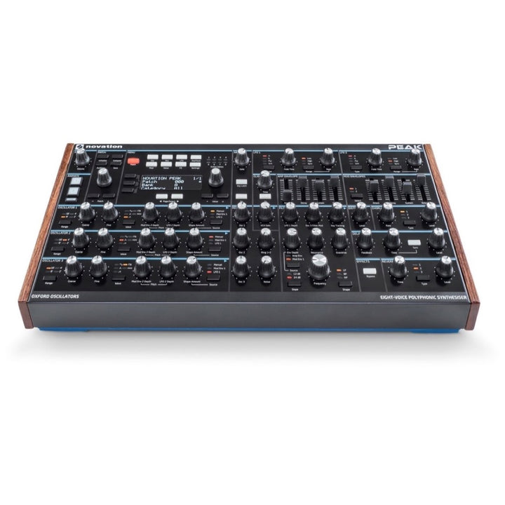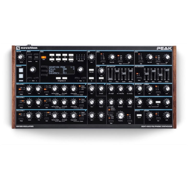 - in an analogue signal chain. Peak is capable of receiving polyphonic aftertouch, which puts expression right at your fingertips. Reverb, delay and chorus effects are at one's disposal, and there is also an on-board arpeggiator. The modulation system puts a 16-slot modulation matrix and 16 direct assignments in the main controls, cleverly arranged for intuitive patch design and sound editing. There are three ADSR envelopes and two LFOs for each voice, and more elaborate movements and secondary 'via' assignments are made just a few menu button presses away. In addition, two animate buttons give live performers instant one-touch transformation of patches. Peak connects to modular systems via a CV modulation input, and has MIDI I/O on five-pin DIN ports, so other MIDI gear can be connected. Via USB, Peak can be plugged into Mac or PC, where unlimited patches can be kept using the Components software.
