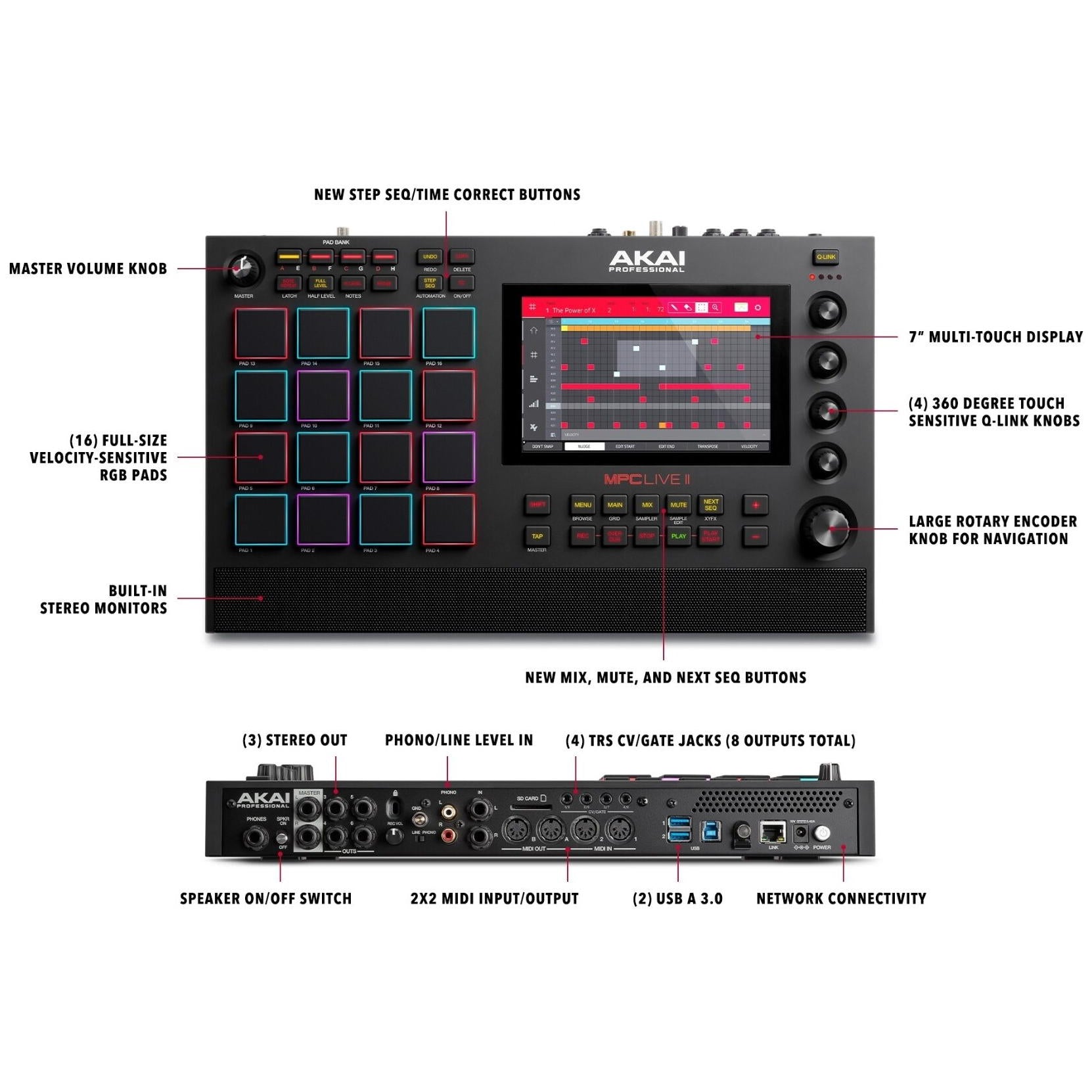 Under the hood, MPC Live II includes the same multi-core processor as the MPC X, with every mainstay you demand from a modern MPC. Take compete command of your production with Akai Professional's iconic 16-pad format. Sequence, edit and chop samples on the bright 7-inch touch screen color display. Shape your ideas with four capacitive-touch knobs and dive into all critical functions with an arsenal of dedicated buttons meticulously arranged for the ultimate production workflow. Backed by a super-intuitive UI, and packed with everything you demand for professional production, MPC Live II is laser-focused on your creativity.