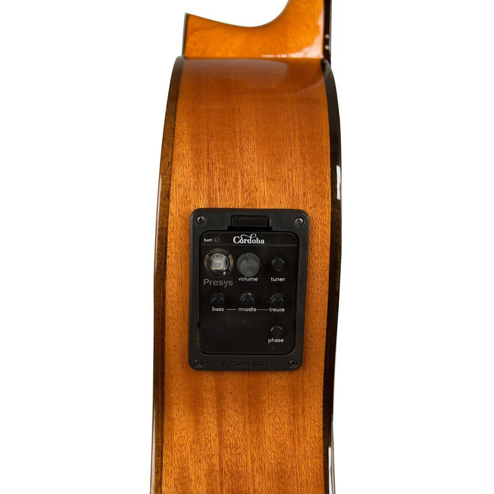 - Fishman Presys pickup with built-in digital tunerCordoba's Fusion series was first to effectively merge the feel of a steel string with the tone of a "classical" guitar, and with a variety of wood options and finishes is the most comprehensive line of crossover style nylon string hybrids on the market.