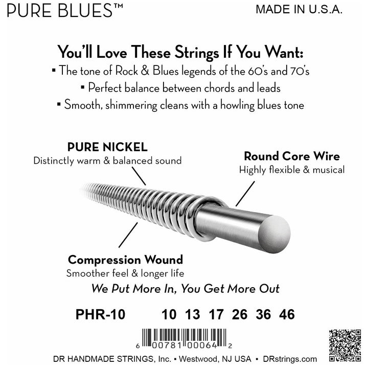 Experience the ultimate tone and playability with DR Strings PHR-10 Pure Blues Nickel Medium Electric Guitar Strings. Utilizing a unique combination of nickel-plated steel and pure nickel, these strings offer a warm and rich sound with enhanced sustain. Perfect for blues, jazz, and rock genres. Try them out and feel the difference in your performance.