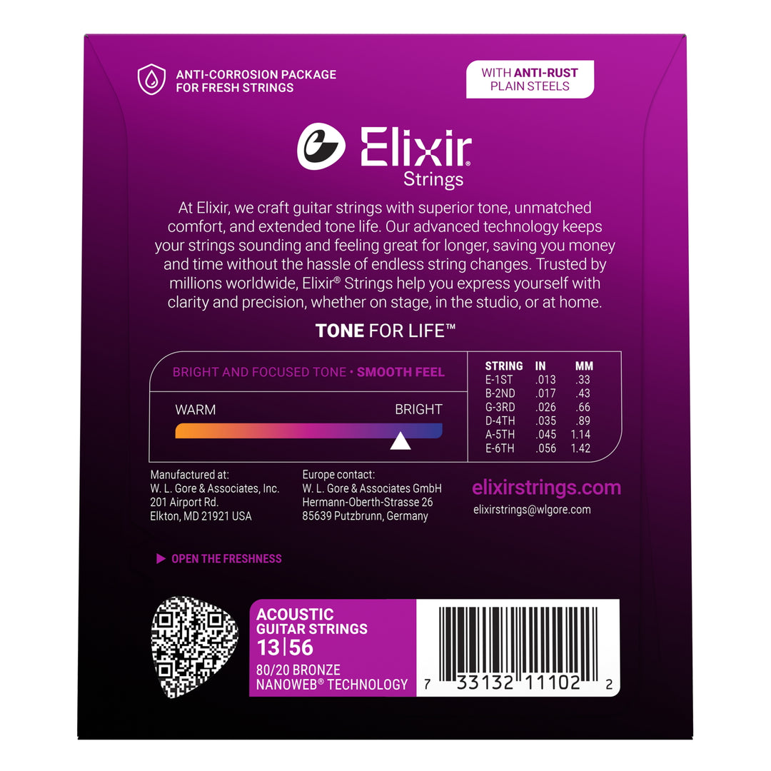 Elixir Nanoweb 80/20 Bronze Medium Acoustic Guitar Strings, 13-56