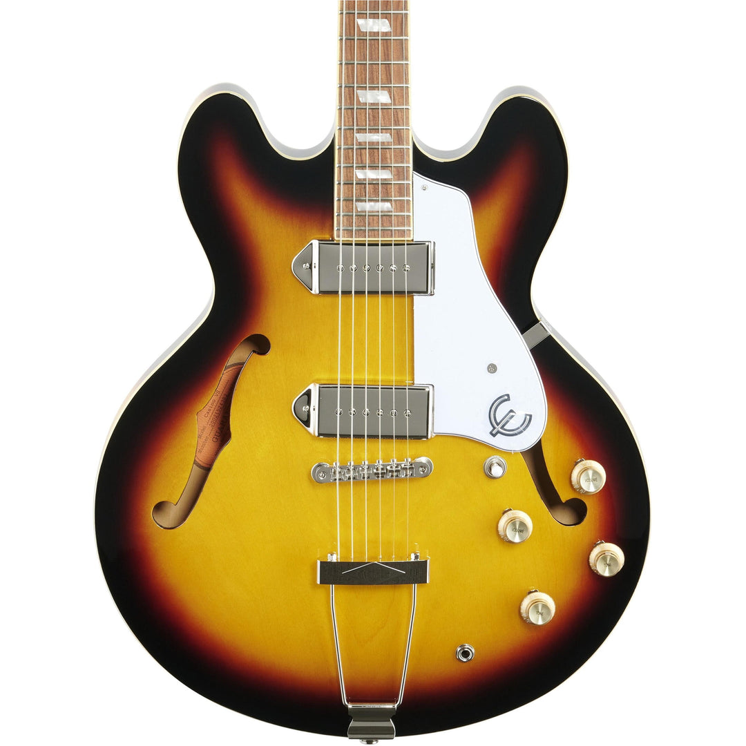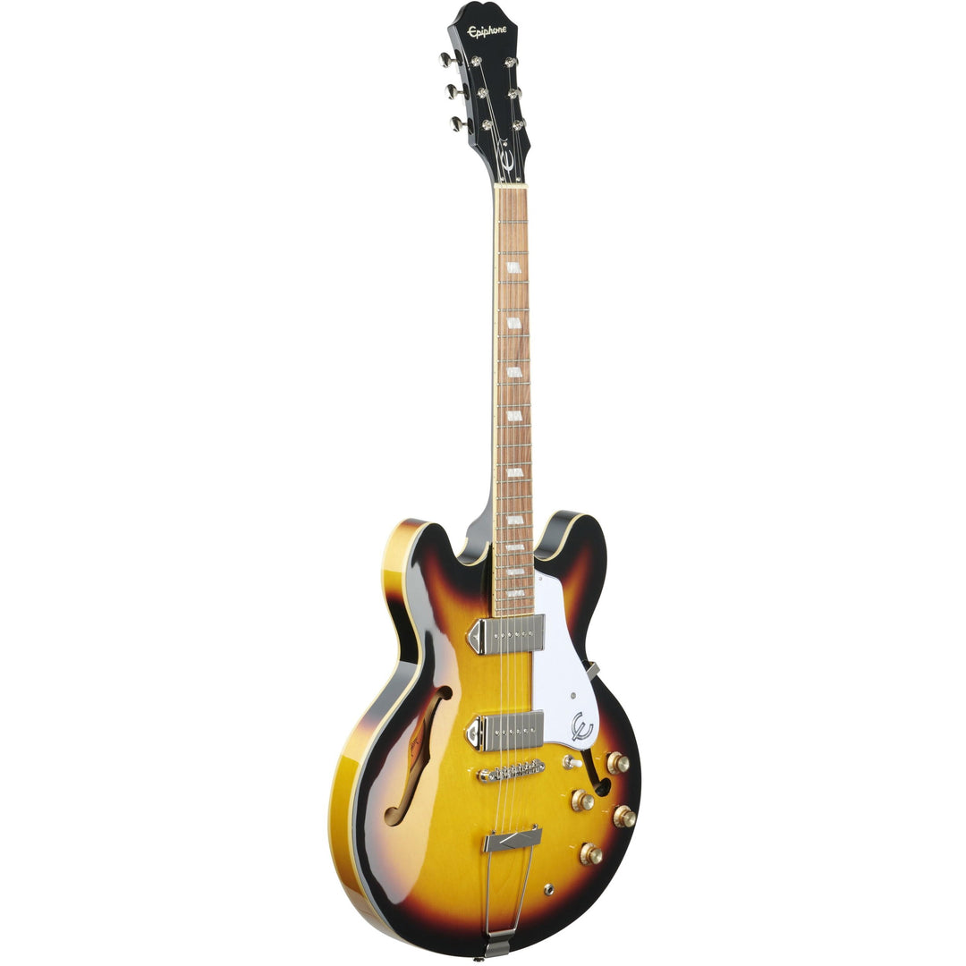 The Epiphone Casino's combination of a laminated maple arched top and hollow maple body offers the discerning tone junkie a veritable smorgasbord of complex tones, rich harmonics and pleasing overtones. Unlike the ES-335 or other semi-hollow instruments of this shape, the Epiphone Casino is a fully hollow instrument. Though slightly more prone to high-gain feedback, an all-hollow guitar is offers richer resonance -- true tone aficionados gladly make the tradeoff. The Epiphone Casino's set mahogany neck and array of dual P-90 dog-ear pickups deliver everything from singing sustain to chimey rhythm jangle, all at the flip of a switch or the stomp of a box. The combination of a pau ferro fretboard with the rest of these carefully selected tonewoods make the Epiphone Casino a wonderfully balanced instrument, both in sound and feel. The four top-mounted control knobs (volume and tone for each of the rhythm and lead pickups) allows for even further tweaking and tonal exploration, presenting a palette rich enough for even the most demanding six-string Centurion.