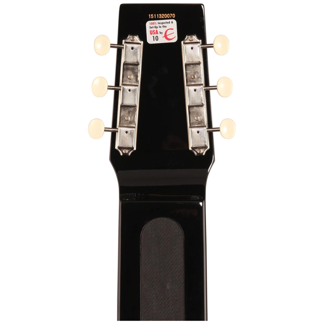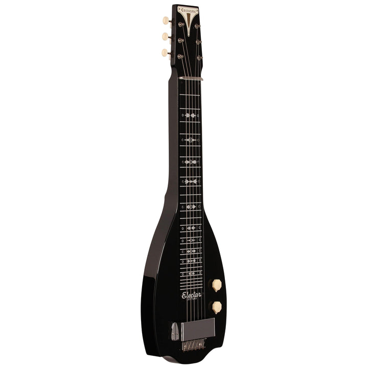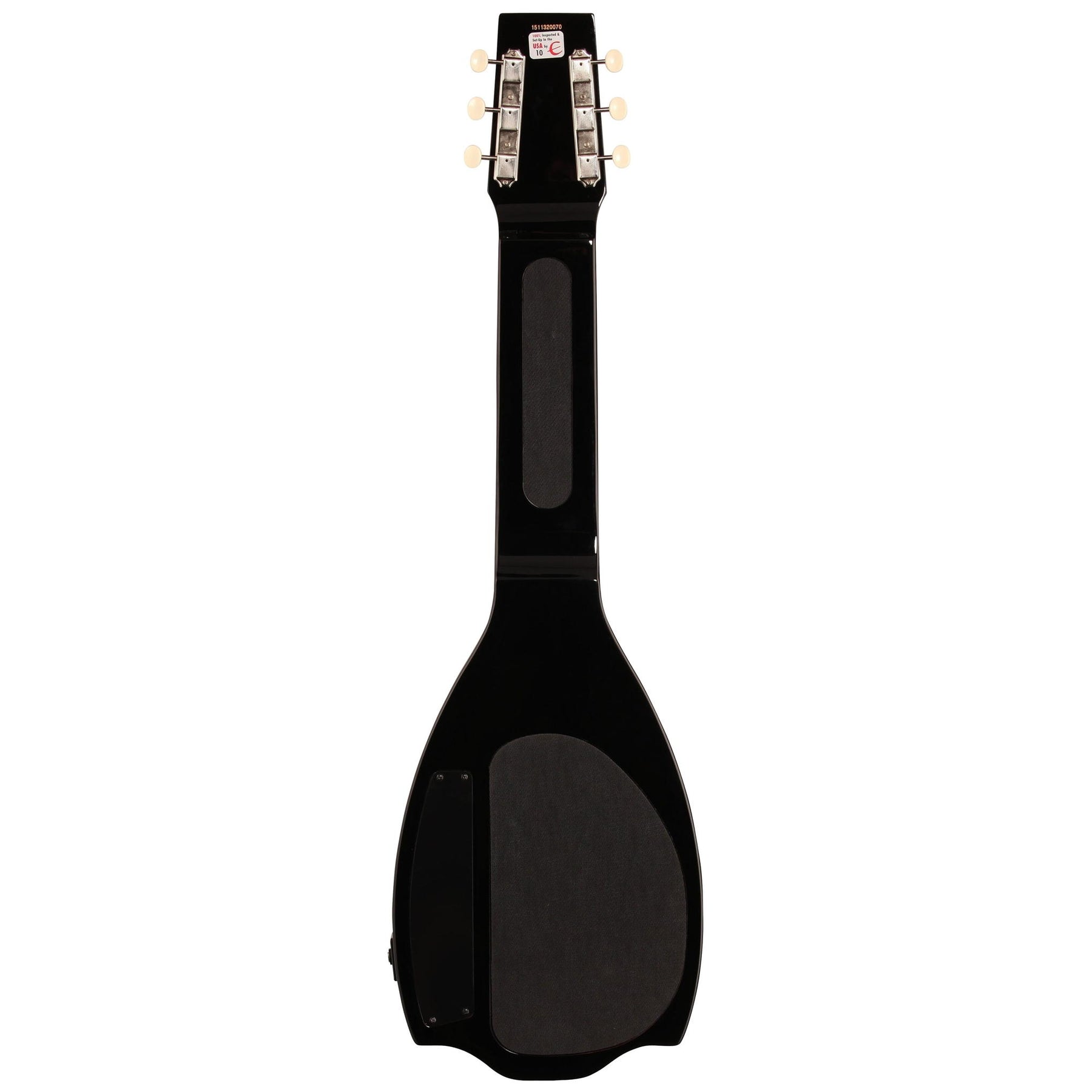 Epiphone Electar Inspired by "1939" Century Lap Steel Outfit: Vintage classic returns with Art Deco design, "Blade Humbucker" and gig bag. Epiphone presents the Electar Inspired by "1939" Century Lap Steel Outfit, a one-of-a-kind reissue of the Art Deco styled Hawaiian lap steel guitar originally designed by Herb Sunshine, Epiphone's legendary salesman, electronics developer, and a good friend of founder Epi Stathopoulo.Herb Sunshine was one of Epi Stathopoulo's key employees at the "House of Stathopoulo" headquarters in New York and helped to inspire Epiphone to become the leading name in affordable professional instruments."Epi's father had brought over their Greek traditions from the old country and Epi was just carrying on where the old man had left off. They had terrific pride. Epi personally examined every guitar and banjo," Sunshine told Epiphone historian Jim Fisch "We called electric guitars and amplifiers "Electar" which is a name I coined."Electar Inspired by "1939" Century Lap Steel: "The ultimate in steel guitar form."The Epiphone Electar Inspired by "1939" Century Lap Steel 6-string Outfit features the same body profile as the vintage original with a one-piece Mahogany body and neck with an Ebony finish. The back of the body has an inset non-slip rubber pad.The "1939" Century neck area has a classic Plexiglass fingerboard with a traditional "1939" Art Deco Replica inlay design with 28 frets that are properly set for great intonation at any position. The headstock features the vintage metal Epiphone badge used on Epiphone's earliest electric archtops from the '40s through the introduction of the Epiphone Casino in 1961! The 2.5" aluminum nut is raised slide and the Wilkinson "Deluxe" 3-in-Line machine heads have ivory colored buttons.The Electar Inspired by "1939" Century Lap Steel is powered by a powerful Epiphone 500B "Blade" Humbucker with beautiful reproduction Epiphone "Circus Tent" knobs for Master Volume and Tone. The bridge and tailpiece are Aluminum with a period-style nickel-plated steel cover.
