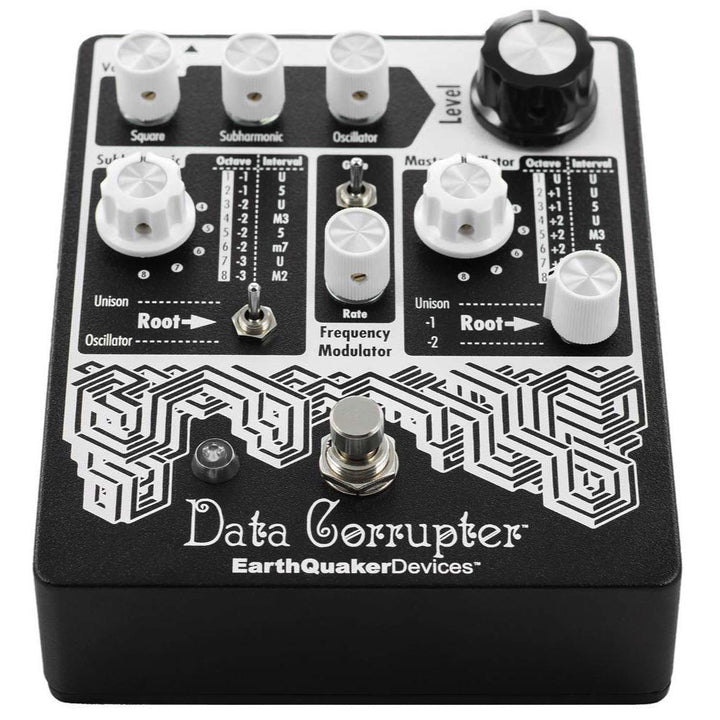 The Subharmonic section of the Data Corrupter creates a sub octave of the Root and then divides it up into eight intervals over three octaves which are selected by the rotary switch to create your subharmonic harmony. The Root comes from one of two sources, Unison or the Master Oscillator. When Unison is selected, the Subharmonic will be a division of the square wave fuzz tone and the Frequency Modulator will have no effect. When Oscillator is selected, the Subharmonic will be a division of the Master Oscillator and the Frequency Modulator will be applied to the Subharmonic harmony.Voice Mixer and Level