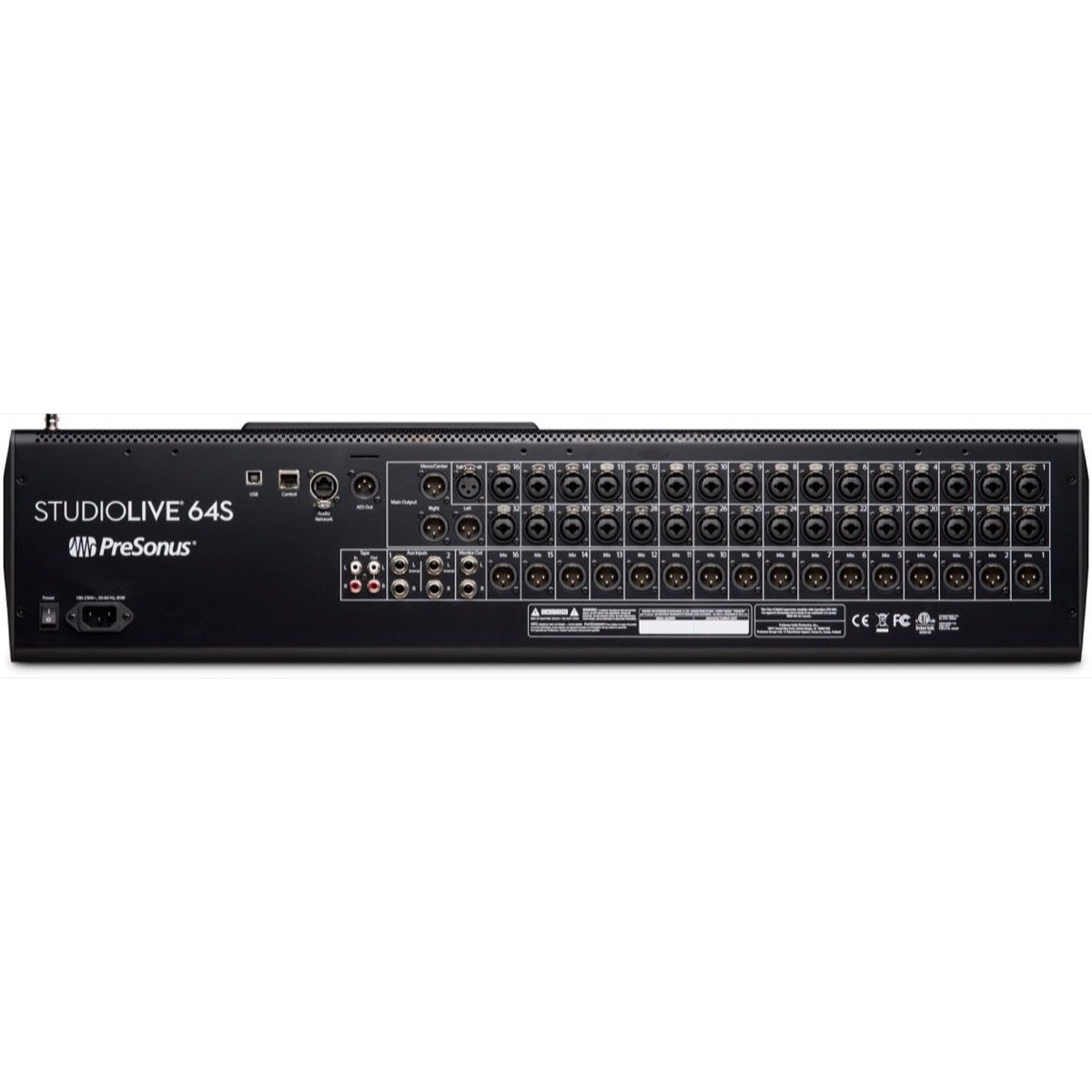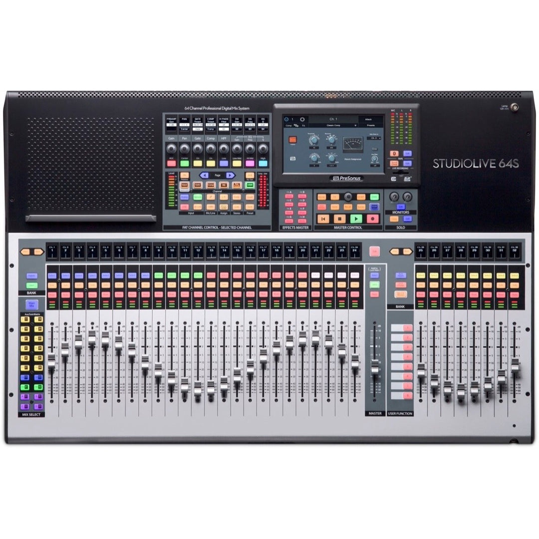 - and the best value. Powered by the PreSonus quad-core FLEX DSP Engine, no other mixer can match its 128-channel (64x64) USB recording, 76 mixing channels, 43 buses, and an astounding 526 processors. Features such as password-protected user profiles for restricting feature access and mixer scenes organized by project, make the StudioLive 64S ideal for installed sound. Thanks to built-in AVB networking, the StudioLive 64S integrates with stage boxes, personal monitor mixers, switches, and more. Managing 76 total inputs is easy with 32 FlexMixes and 24 DCA groups. The Fat Channel processing section offers expandable plug-ins with vintage-style EQ and compression options on every channel and output bus.