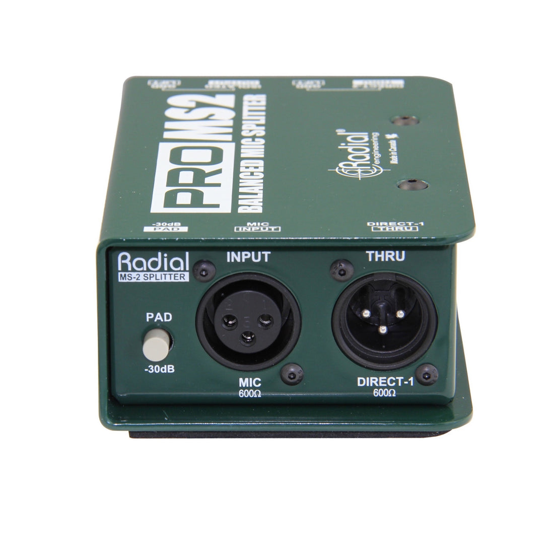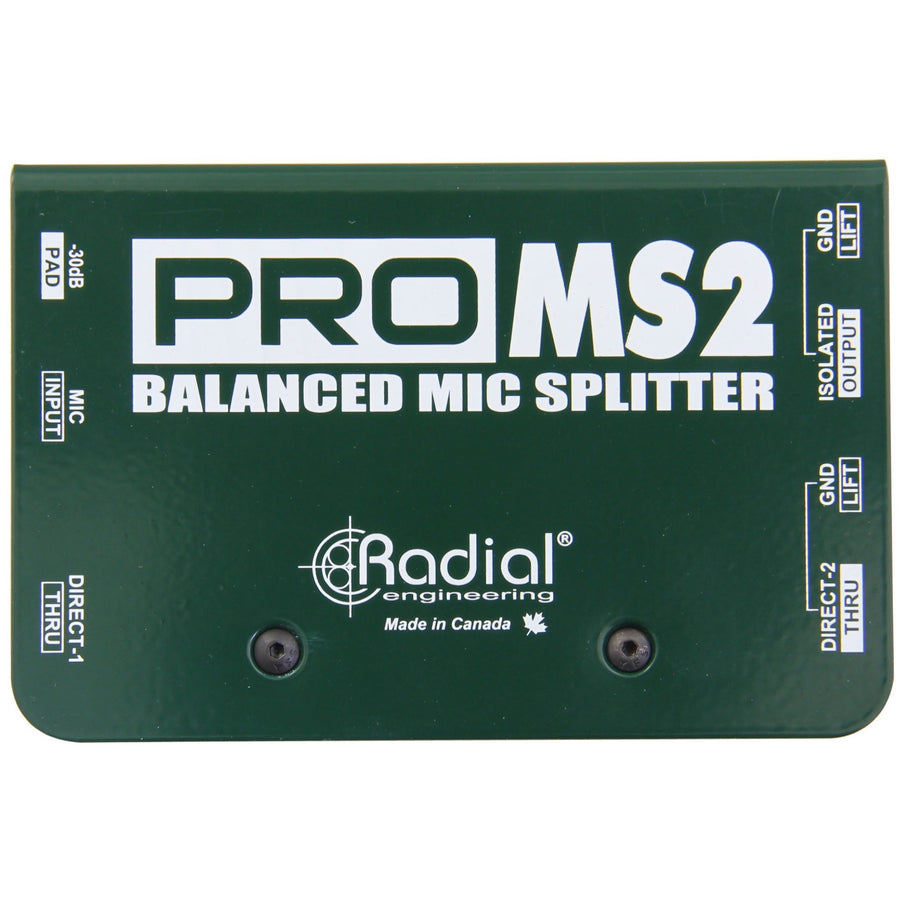 - you merely plug in and the ProMS2 automatically springs to life to deliver pristine audio without artifact or color.The magic inside the ProMS2 is a premium Eclipse ET-MS10 transformer. This features a nickel laminated core that delivers a wide frequency response and exceptional signal handling with virtually zero distortion at all frequencies. And with better than 115dB of common mode noise rejection, you can rest assured that hum and buzz caused by ground loops and stray DC currents will be kept at a minimum. To shield against stray magnetic fields, the transformer is doubly protected with an integral mu-metal can plus a rugged external steel enclosure. This is augmented with RF filtering and a 100% discrete signal path to ensure optimal signal flow.As with all Radial products, construction begins with rugged 14-gauge steel for maximum durability. A unique book-end design creates a recessed zone around the switches and connectors to protect against the harsh environment of concert touring. An internal I-beam frame makes it virtually impossible to torque the PC board which could otherwise compromise the sensitive solder joints. The innovative design has the unique advantage of allowing up to 8 units to be rack-mounted using the Radial J-Rak. Typical applications include splitting a signal in the studio to feed more than one preamp, feeding a stage mic to more than one mixing console, or even splitting the signal from a live stage to supply a broadcast feed.