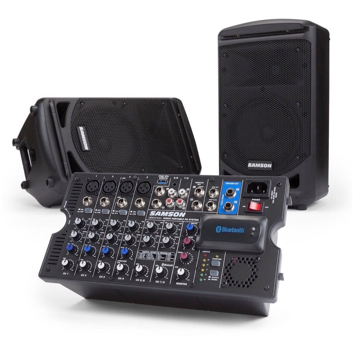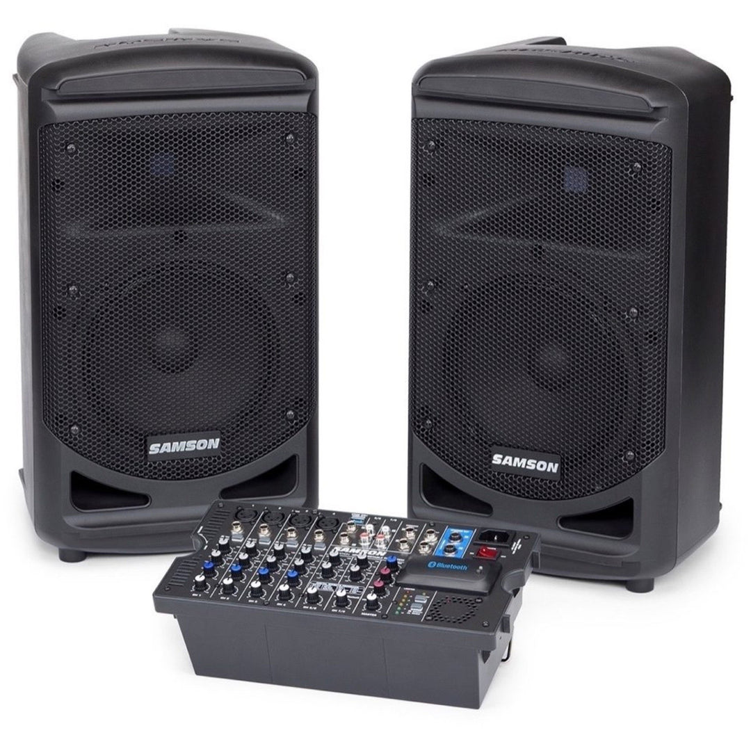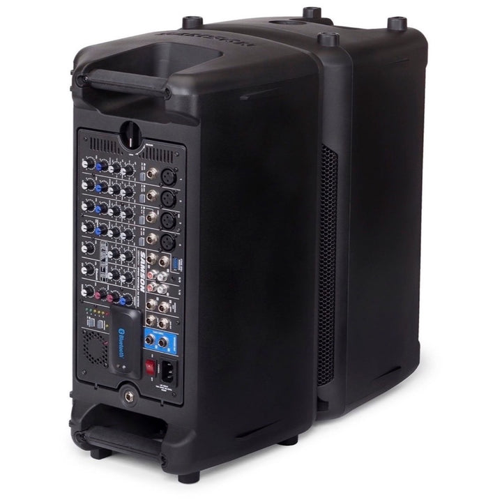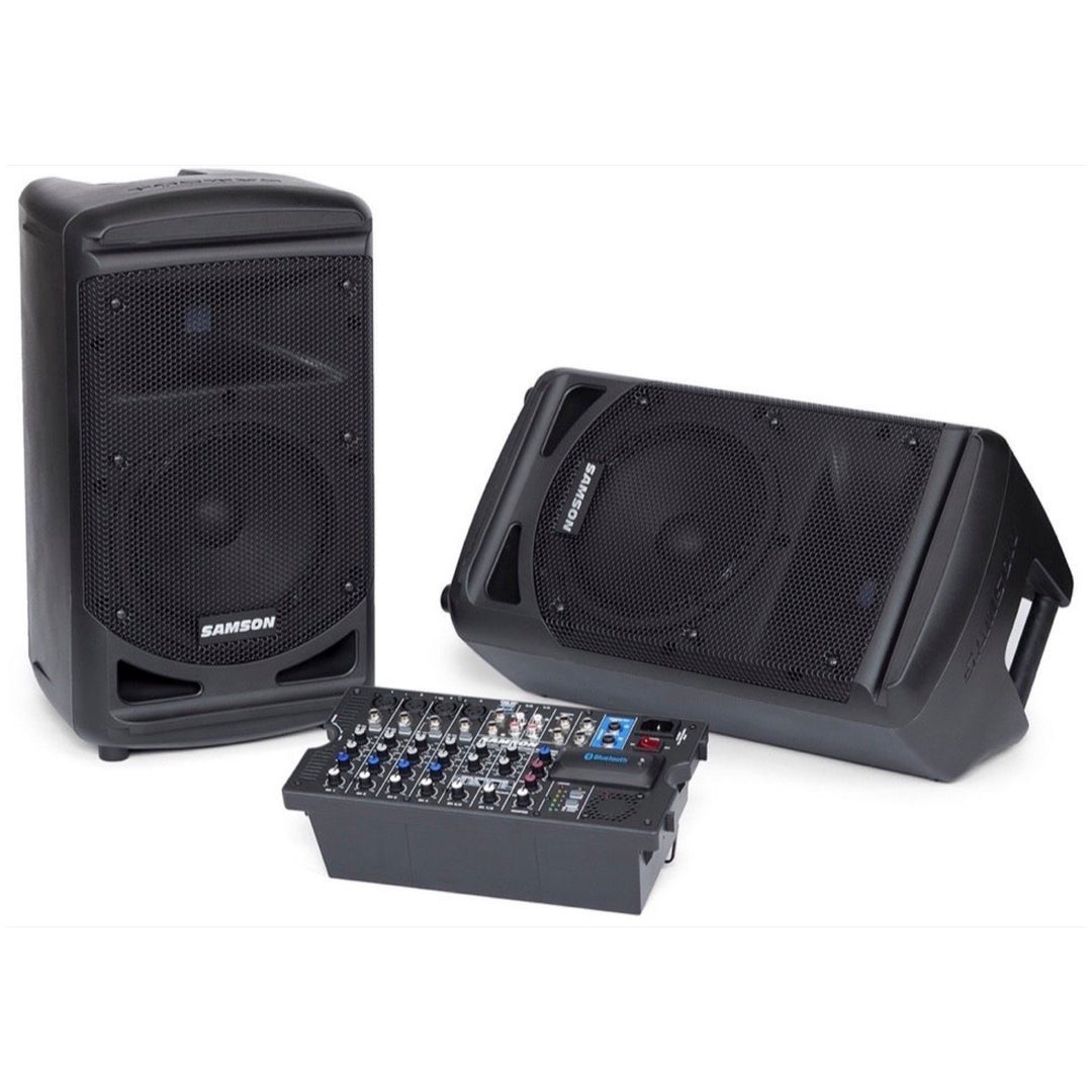 The Samson XP800's speaker enclosures feature a tilt-back design so they can be used as stage monitors as well as with 1 3/8" speaker stands. The mixer section can be removed and mounted on any standard mic stand using Samson's SMS308 Mixer Bracket (optional).